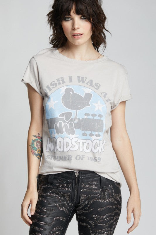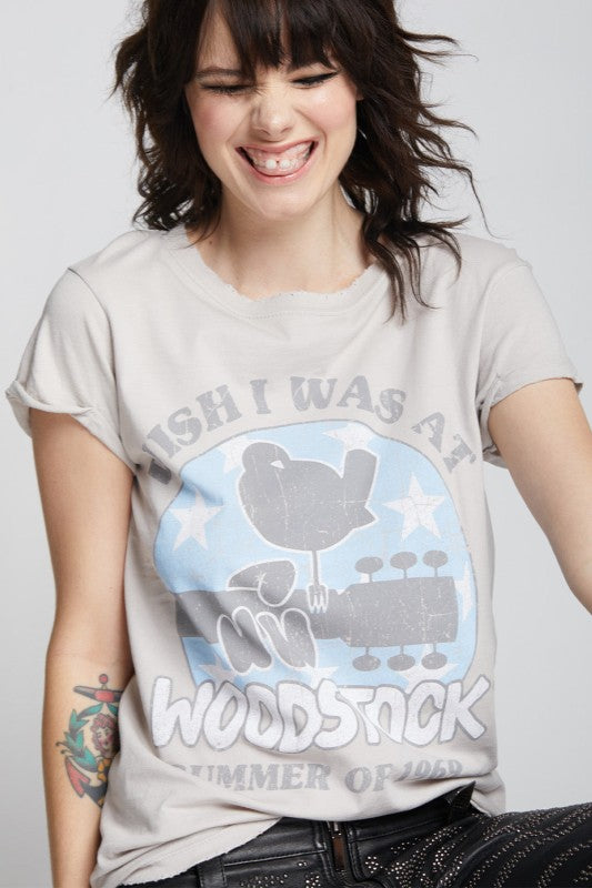 Pay homage to the legendary 1969 three-day music festival, Woodstock. You'll be repping a piece of music history in style, with \"Wish I Was At Woodstock\" verbiage, the iconic Woodstock logo, and “Summer of 1969”. Made with soft cotton fabric, a ribbed crew neckline, our popular fitted style, cuffed sleeves, and distressed edges.