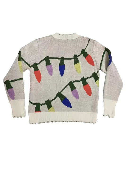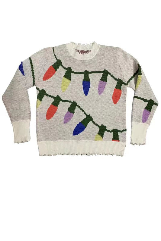 - All over Xmas light intarsia- Tattered detail at hem, cuffs and collar