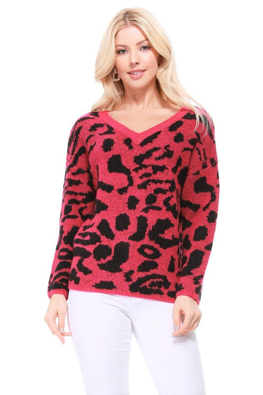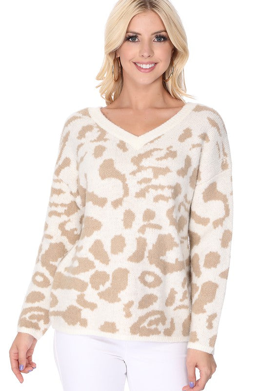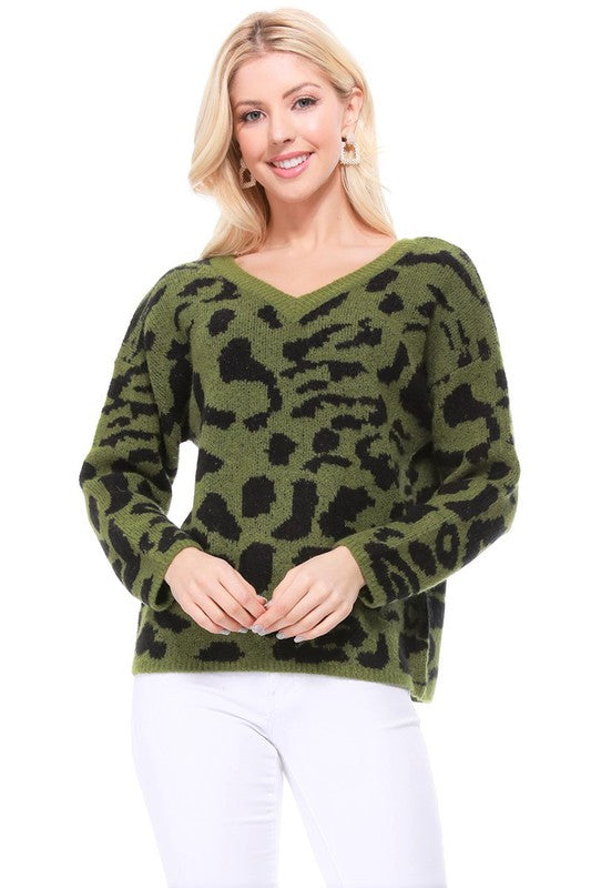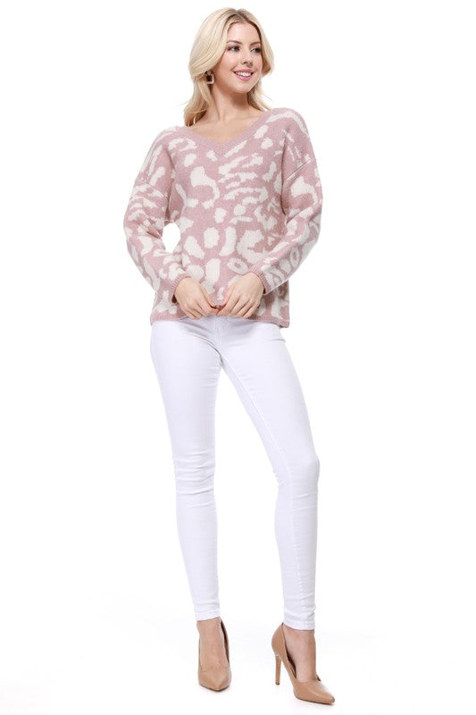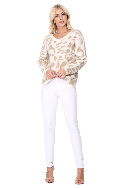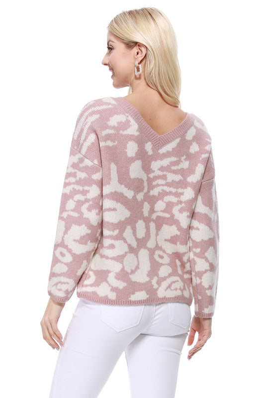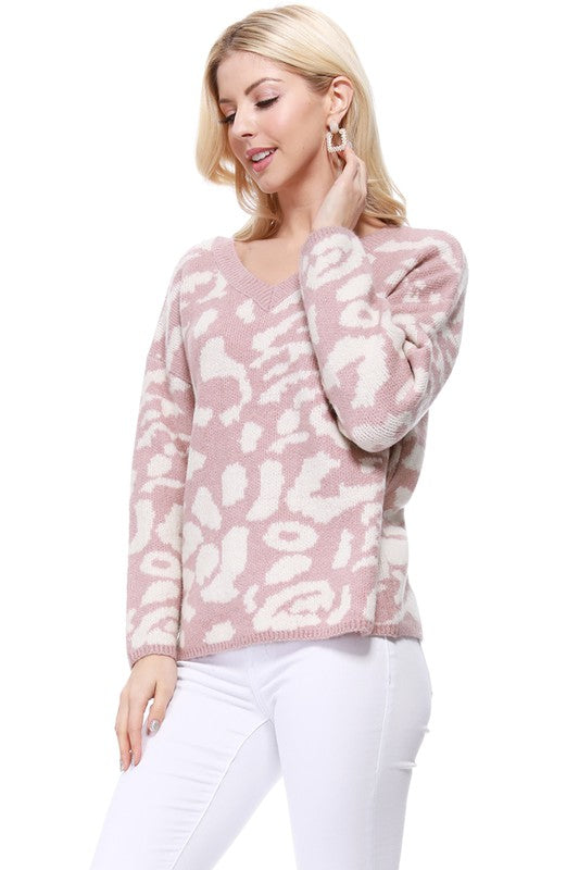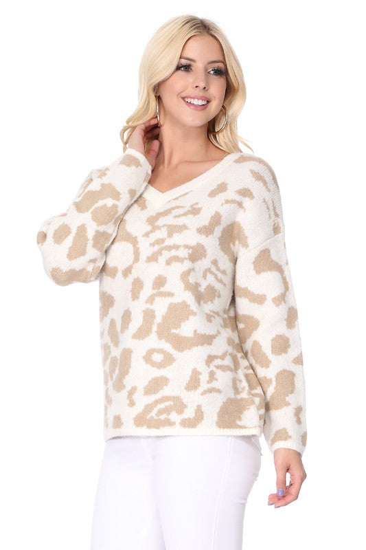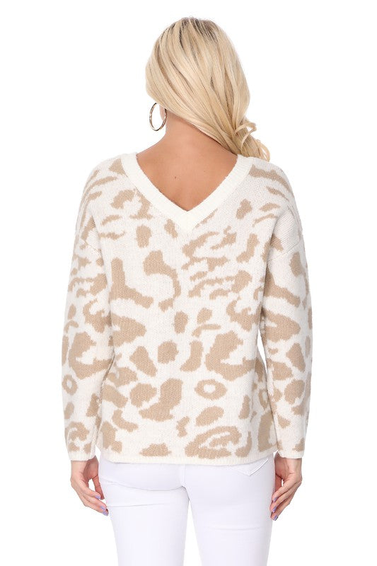 - Leopard Jacquard Patterned V-neck long sleeve loose fit pullover.