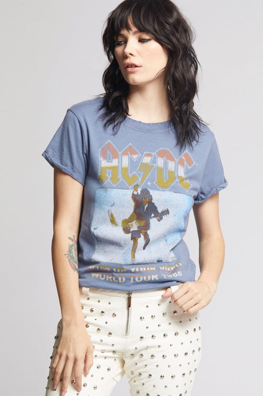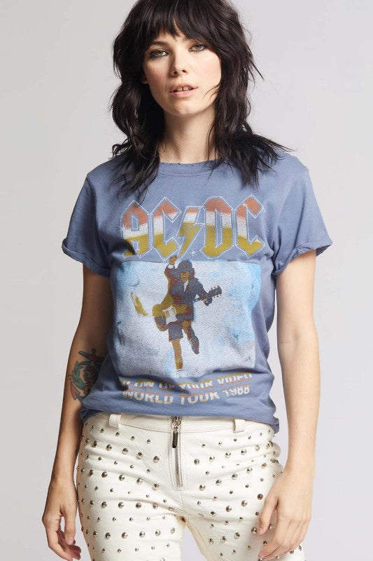 Throw on this tee and you'll feel like you just got it at an AC/DC show back in '88. It's a throwback to their Blow Up Your Video U.S. tour, complete with the album's iconic cover on the front and all the tour details on the back, all laid out on a soft, vintage blue cotton fabric.