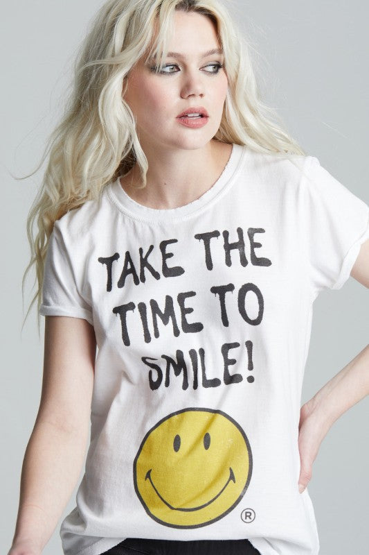 You always have extra time to smile! This Smiler tee features the phrase \"Take The Time To Smile!\" and the iconic Smiley graphic in the front. M ade with cotton fabric, a crew neckline, cuffed short sleeves, and a feminine fitted style.