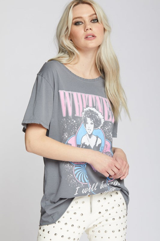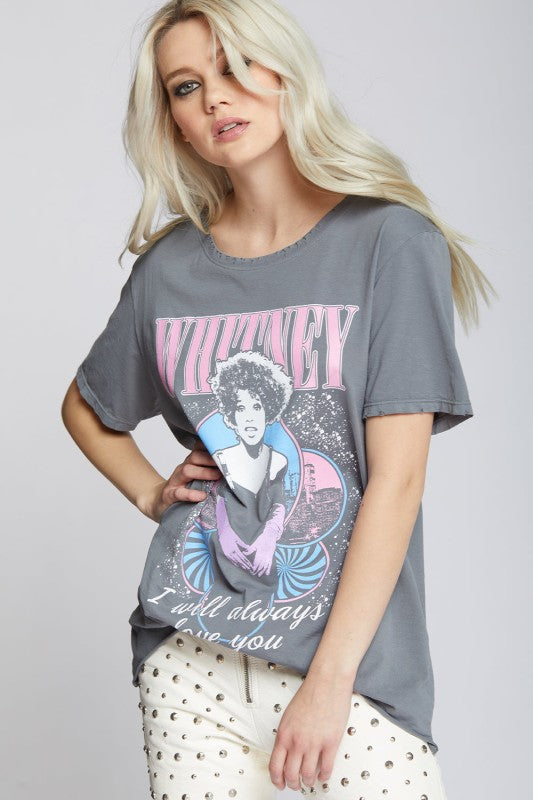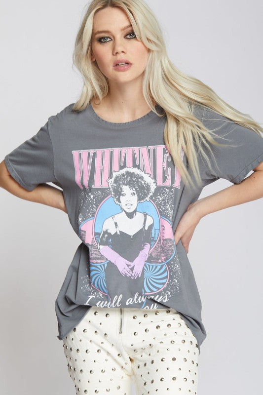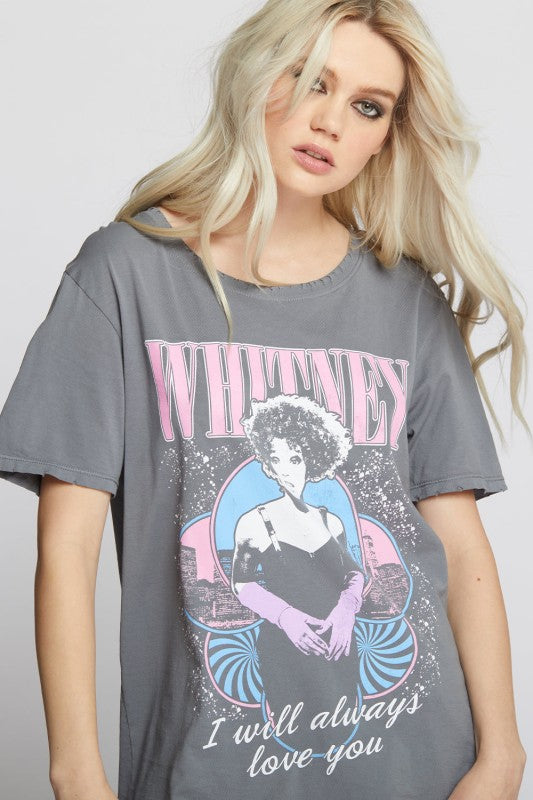 This Whitney Houston tee features the black and white graphics of the artist in a dramatic, glamorous pose, set against a background of a cityscape and abstract, swirling flower-like elements, with the song title I will always love you across the bottom.