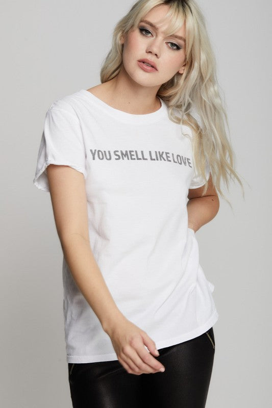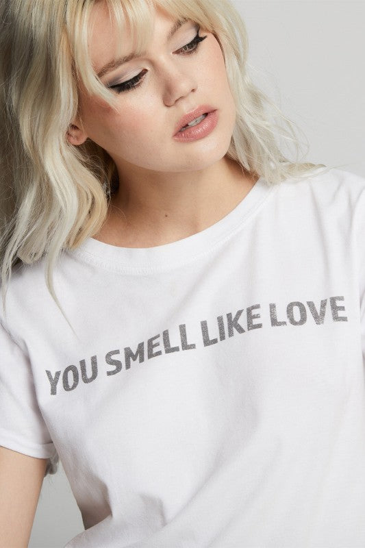 This graphic is the sweetest compliment wrapped up in a fitted tee. The phrase You Smell Like Love is printed in a soft, simple block text, giving it a minimalist touch.